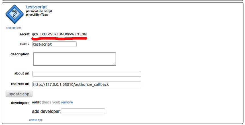 The random string of letters under your app’s name is its client id. The random string of letters next to secret are your client_secret and should not be shared with anybody. At the bottom is the redirect_uri. ... This example, like most of the PRAW examples, binds an instance of PRAW to the r variable.