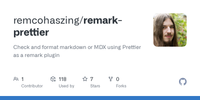 Check and format markdown or MDX using Prettier as a remark plugin. Latest version: 2.0.0, last published: 3 years ago. Start using remark-prettier in your project by running `npm i remark-prettier`. There are 3 other projects in the npm registry using remark-prettier.