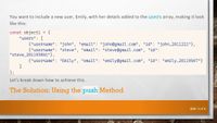push() is for arrays, not objects, so use the right data structure.