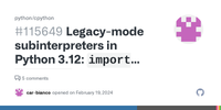 Bug report Bug description: Hello everyone, I am working on an application embedding multiple Python subinterpreters - for which the Python version should be upgraded from Python 3.10 to Python 3.12.1. For the time being, the "legacy ver... More on github.com