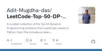 GitHub - Adit-Mugdha-das/LeetCode-Top-50-DP-Solutions: A curated collection of the Top 50 Dynamic Programming problems from LeetCode, solved in Python. Each file includes a clean, optimized solution to help strengthen core DP concepts like recursion, memoization, tabulation, and space optimization. Perfect for interview prep and mastering DP patterns.