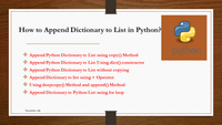 May 31, 2024 - We can also use the dict() to do a shallow copy of the dictionary and use this copied dictionary to the append() method to add the dictionary to the end of the list. This method also yields the same output as above.