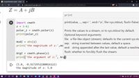 November 20, 2024 - Python also provides functions and methods for working with complex numbers, such as the conjugate (conjugate()), magnitude (abs()), and argument (phase()): # Conjugate number = 3 + 4j conjugate = number.conjugate() print(conjugate) # Output: (3-4j) # Magnitude magnitude = abs(number) print(magnitude) # Output: 5.0 (square root of 3^2 + 4^2) # Argument (phase) argument = cmath.phase(number) print(argument) # Output: 0.9272952180016122 (in radians)