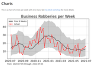 July 10, 2021 - You can go look at the notebook itself, but I also have an example of generating a weekly error bar chart (much preferred over the Compstat YTD tables): Final note, to compile the notebook without showing any code (the police chief does not want to see your python code!), it looks like this from the command line. jupyter nbconvert --execute example_report.ipynb --no-input --to html · I have further notes in the github page on automating this fully via bat files for windows, renaming files to make them update to the current date, etc.