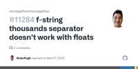 f-string thousands separator doesn't work with floats · Issue #11284 · micropython/micropython