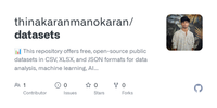 GitHub - thinakaranmanokaran/datasets: 📊 This repository offers free, open-source public datasets in CSV, XLSX, and JSON formats for data analysis, machine learning, AI projects, dashboards, and academic practice. The data is clean, structured, easy to use, and compatible with Power BI, Tableau, Excel, Python, and SQL.