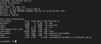 July 17, 2023 - import platform import subprocess def get_system_info(): # Retrieve system information using 'platform' module system_info = { 'System': platform.system(), 'Node Name': platform.node(), 'Release': platform.release(), 'Version': platform.version(), 'Machine': platform.machine(), 'Processor': platform.processor() } return system_info def get_disk_space(): # Get disk space information using 'df' command and store it in a variable disk_space_info = subprocess.run(['df', '-h'], capture_output=True, text=True) return disk_space_info.stdout if __name__ == "__main__": system_info = get_system_info() p