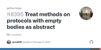 Default method implementation (def f(self): return 5) | -1 (implementations shouldn't be in the interfaces) | -1 (same, and mypy doesn't catch this) |
