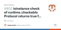 Asked this question on stackoverflow but I am copying here as this seems to be an untended results based on PEP 544. If a protocol is implemented with a requried attribute i.e. name @runtime_checka... More on github.com