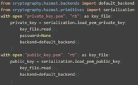 from cryptography.hazmat.primitives import serializationfrom cryptography.hazmat.primitives.asymmetric import rsafrom cryptography.hazmat.backends import default_backendfrom cryptography.hazmat.primitives.asymmetric import paddingfrom cryptography.hazmat.primitives import hashesimport binascii