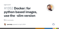 At the time, we're fine with slim (debian buster) build variants, preferring slim over alpine (for most compatibility). If you're really up to further size optimization, I'd recommend you to take a look at some excellent builds of these guys:
