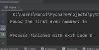 July 27, 2023 - Once we find an even number, we’ll ... result. numbers = [23, 14, 17, 6, 31, 12, 9, 8] for num in numbers: if num % 2 == 0: # Check if the number is even print(f"Found the first even number: {num}") break else: print("No even number found in the list.") ... numbers ...