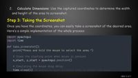 And just find the screenshot.png file containing the screen shot of the first monitor. There are a lot of possibile customizations, you can play with ScreenShot objects and OpenCV/Numpy/PIL/etc..