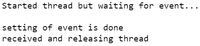 If you run the above script and it terminates, all should be well :-) Notice that a hundred threads are waiting for the event to be set; it's set and cleared straight away; all threads should see this and should terminate (though not in any definite order, and the "All done" can be printed anywhere after the "Press enter" prompt, not just at the very end.
