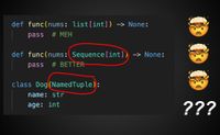 Now take a similarly-structured type, tuple. By similarly-structured, I mean that you access and iterate through tuples the same way, in fact they are both Sequence types. The thing with tuple is that its args are index sensitive. I understand why this is the case and why it makes sense (because of immutability), but what doesn't make sense to me is why mypy is fine now with the comma notation with tuple but not list.