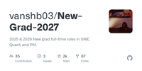 GitHub - vanshb03/New-Grad-2027: 2025 & 2026 New grad full-time roles in SWE, Quant, and PM. · GitHub