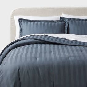 Stripe comforter look in grey, navy, blue for casual and modern bedroom style with simple coordinating stripe design on sheet set