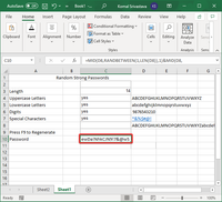 September 1, 2024 - When I first created this spreadsheet, I used a simple-minded technique to create a random password. I started with a formula that returns one random character drawn from that string living in cell D8: ... This tells Excel to generate a random number from one to the length of the string and return one character at that location.