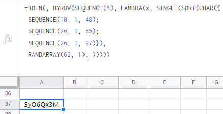 =CONCAT(IF(ROW(1:8),MID("ABCDEFGHIJKLMNOPQRSTUVWXYZabcdefghijklmnopqrstuvwxyz0123456789",RANDBETWEEN.NV(1,62),1),))