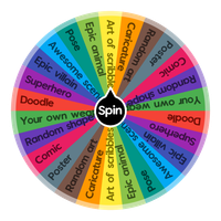 Spin the wheel to randomly choose from these options: Doodle, Superhero, Epic villain, Awesome scene, Pose, Epic animal, Art of scribbles, Caricature, Random art, Poster, Comic, Random shape, Your own weapon!