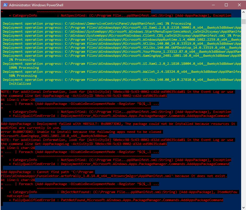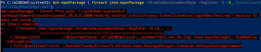 Get-AppXPackage | Foreach {Add-AppxPackage -DisableDevelopmentMode -Register "$($_.InstallLocation)\\AppXManifest.xml"}