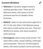 Reitmans (Canada) Limited is a Canadian retailing company, specializing in women's clothing. The company operates several store brands, including Reitmans, Penningtons, and RW&CO. Reitmans was founded in 1926 by Herman and Sarah … Wikipedia