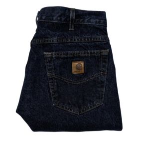 Denim endures. From your first pair of blue jeans as a kid, you’ve always loved the feel and comfort of denim. Built to endure harsh jobs. 15-ounce, 100% cotton denim Sits above the waist Comfortable fit through the seat and thigh with more room to move Stronger sewn-on-seam belt loops Tapered leg opening fits over boots Carhartt leatherette label sewn on right rear pocket Relaxed fit