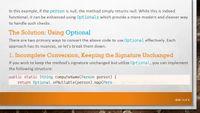 When the return type of a method is Optional<T>, then the caller is forced into explicitly handling the null case. Example · In the example below, the class has a private LocalDate that holds a birth date. It has no "empty" default value. The getBirthDate method returns an Optional<LocalDate> to the caller. import java.time.LocalDate; import java.util.Collections; import java.util.LinkedHashSet; import java.util.Objects; import java.util.Optional; import java.util.Set; import java.util.stream.Stream; public final class Human { /** Constructor.