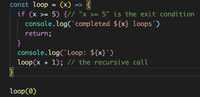 Following example is a recursive approach. A recursive function usually receive an argument to be processed and return a final value that bubbles(returned) up to the first caller.