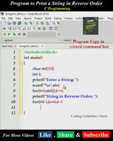 #include <stdio.h> int main() { ... (str[count] != '\0') { count++; } j = count - 1; //reversing the string by swapping for (i = 0; i < count; i++) { rev[i] = str[j]; j--; } printf("\nString After Reverse: %s", rev); }...