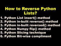 Learn how to reverse a list in Python using `.reverse()`, `reversed()`, slicing, the two-pointer method, loops, and recursion with examples.