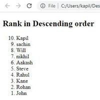 July 23, 2025 - <!DOCTYPE html> <html> <body> <h2>Rank in Descending order</h2> <ol reversed> <li>Kapil</li> <li>sachin</li> <li>Will</li> <li>nikhil</li> <li>Aakash</li> <li>Steve</li> <li>Rahul</li> <li>Kane</li> <li>Rohan</li> <li>John</li> </ol> </body> </html> ... Example 2: Using the start attribute, you can specify at what number you want the list to begin.