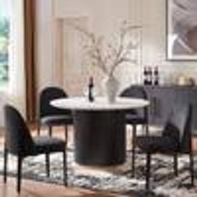 Dine in style with the Gia dining table set. This set includes a round dining table and four chairs, making it ideal for smaller spaces or intimate gatherings. The dining table has a shelf underneath that makes it a perfect place to store kitchen items.