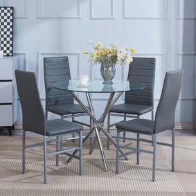 5pc Round Glass Dining Set Table : 10mm Tempered Clear Glass Table with Black BaseChairs : Black Metal Frame with Grey Fabric Seats