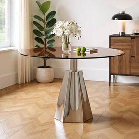 This modern round dining table grounds your dining space in a sophisticated look. The clear glass tabletop creates an open, airy feel and allows you to showcase your favorite place settings. Its steel base, finished in a warm walnut hue, offers a sleek and contemporary look that complements a variety of decor styles.