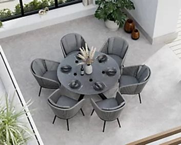 A 6 seater round garden table and chairs set is a stylish and functional choice for family meals and outdoor entertaining. Its curved design promotes a sociable dining experience, while sturdy materials such as wood, metal, or rattan ensure ...