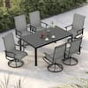 This elegant set includes a spacious 53" round dining table and 6 curved swivel chairs with breathable Textilener fabric. The chairs offer 360-degree rotation for comfort and ease of movement, perfect for outdoor gatherings.