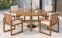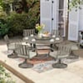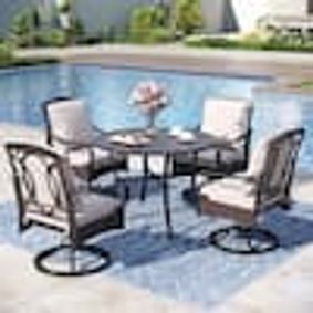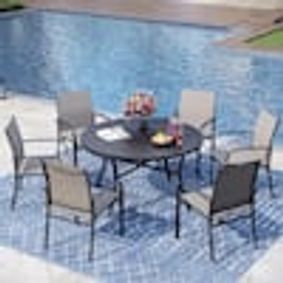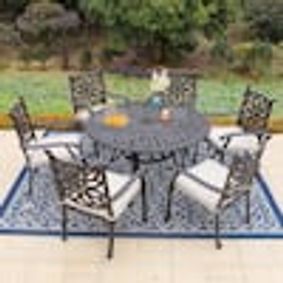 Our collection includes a wide variety of round patio dining table and chairs options, ranging from cast aluminum sets with swivel-rocking chairs to acacia wood dining sets with umbrella holes and removable cushions. For those prioritizing durability, our aluminum patio furniture is rust-resistant and lightweight, making it easy to move and maintain.