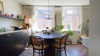 The dining table’s small footprint and portability allows it to double as terrace furniture as needed. The plant-filled, atrium-like quality of the Scheeps project in Amsterdam was intentionally created by prioritizing sight lines throughout the design of the 45sqm/484sqft space. The round dining table’s soft, curvilinear edges and compact design maintain the home’s open, airy feel.