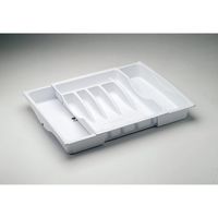This Rubbermaid white adjustable cutlery tray/drawer expands from either side to fit drawers 11.5'' To 19'' wide. Its roomy side compartments hold large gadgets neatly. It is also uniquely designed to stay in place with rubber grips on both sides and the bottom. SIZE: 14.63 x 11.6 x 2.52 inches, Expands from 11.5 Inches to 19 Inches. COLOR: White. MATERIAL: Plastic.