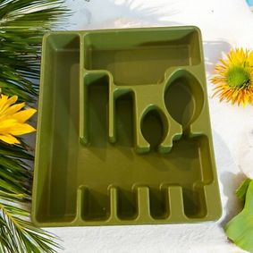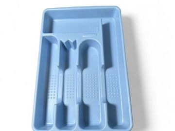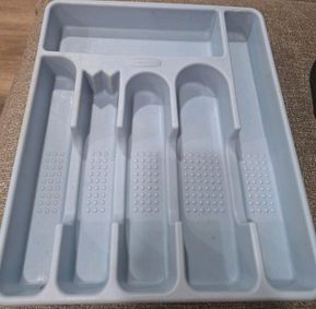 The Rubbermaid No Slip Cutlery Tray makes it easy to organize and sort your flatware and kitchen tools. The cutlery tray has separate compartments to store spoons, forks, knives, and extra utensils. The Rubbermaid No Slip Cutlery Tray is dishwasher safe and features a slip-free base that stays in place when the drawer is opened and closed.