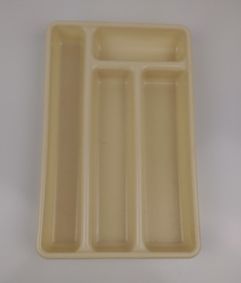 Large white plastic cutlery tray for 5 piece place settings. Includes separate compartments for knives, forks, spoons, and extra utensils. A great way to keep your kitchen and utensils organized for your house.