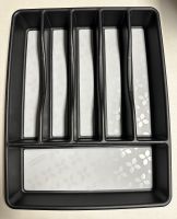 Versatile Organization: Perfect for storing kitchen gadgets, utensils, and small tools with separate compartments for easy access.     Durable Construction: Made with high-quality plastic for long-lasting strength and resistance to wear and tear.     Adjustable Sections: Includes customizable dividers that allow you to organize the tray to suit your specific storage needs.     Non-slip Base: Features a non-slip bottom to keep the tray securely in place, preventing it from shifting in the drawer.     Sleek Design: The modern black color and streamlined design enhance the look of any kitchen dra