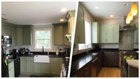 Here’s our before photos from when we bought the house. We’ve been diy renovating the entire house and we are finally at the point where we are picking out colors for cabinets in the kitchen. We are changing the layout to be less galley and more of a ‘U’ shape opening toward the dining room by moving the sink to the bay window and closing the pass through. That being said, I LOVE a green earthy kitchen and my husband wants black stone for the countertops. Which green looks better. We put black contact paper on the current countertops to get that similar idea! Also, please ignore the microwave. The one that matches the stove is still in the box!!