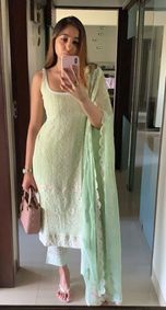 Our Sage Green Embroidered Satin Pant Suit includes a net top with satin inner, net bottom with satin inner, and a chiffon dupatta. Embroidery is present on this style using zari, thread, and sequins embellishments.