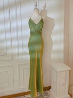 With its elegant sage green hue, this Semi-Formal Party Dress strikes the perfect balance between sophistication and style.Be it a wedding or a formal event, this dress ensures you look effortlessly classy and fashion-forward.Material: Glitter ChiffonNeckline: Spaghetti StrapLength: FloorEmbelli...