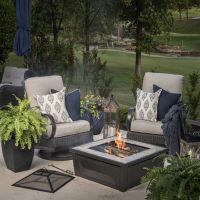 The Homewood set features a 60-inch round porcelain tabletop fire pit with 55000 BTU and glass filler beads. The fire pit is equipped with electronic ignition and an adjustable flame height.