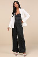 You'll always make a sparkling statement in the Lulus Memorable Style Black Satin Wide-Leg Pants! Sleek and shiny woven satin boasts a subtle plisse texture and sparkling, rhinestone-like studs. High, elasticized waist tops wide legs that fall to ankle-length hems. Hidden zipper at side.