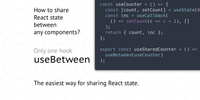Answer from Yangshun Tay on Stack OverflowIf you are referring to component state, then hooks will not help you share it between components. Component state is local to the component. If your state lives in context, then useContext hook would be helpful.
