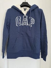 Soft comfy fleece. Full sherpa lining. Long sleeves with banded cuffs. Drawcord ties at hood zip front. Gap logo at front. Kangaroopockets. Banded hem.
